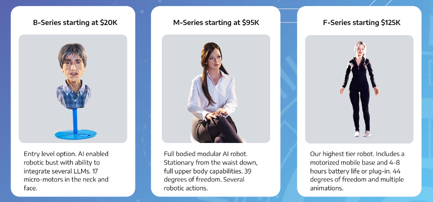 - F-Series ($125K): Mobile robot with 44 degrees of freedom and 4–8 hours battery life.